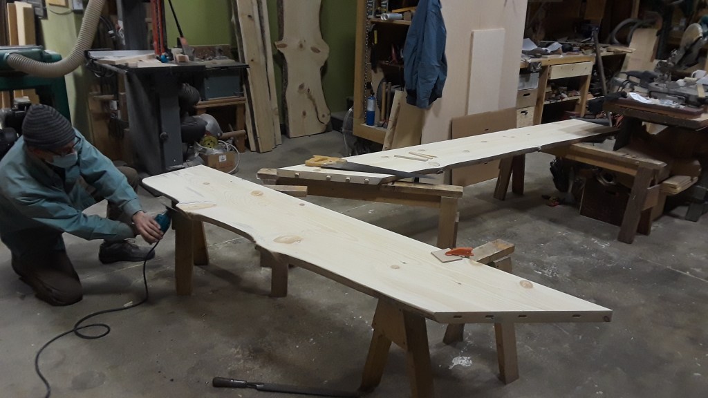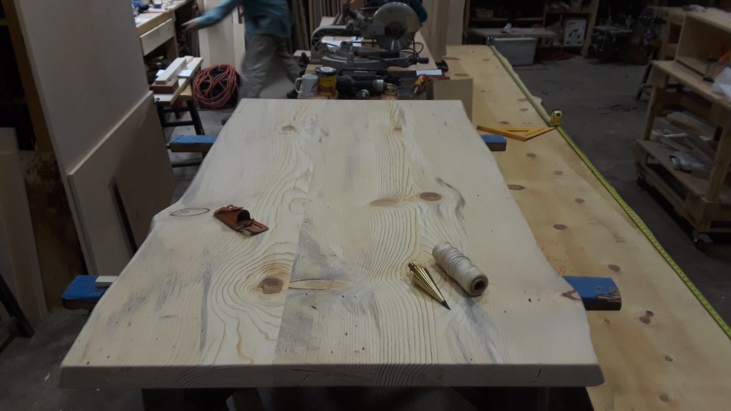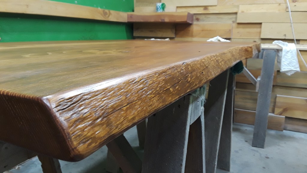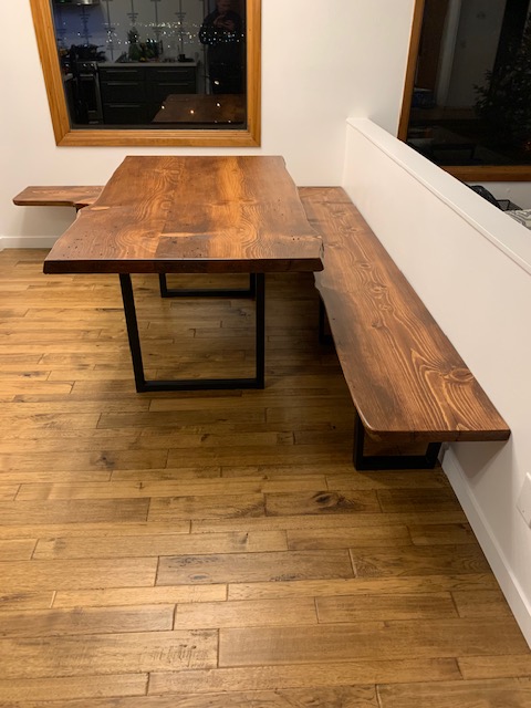 We Built this table and bench out of blue stained pine slabs. It can be tricky staining softwoods, but this table turned out pretty nice, and the customers love the rustic appeal of the live edges, and wood borer holes. The bench is made in two pieces that attach to one another when in use, but separate for easy transport onto the customers deck for outdoor dining.