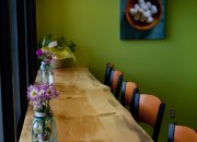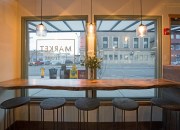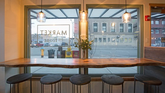 Structural Aesthetics crafted these tables and chairs using Bad Goat Wood for the seating at the Market on Front. Norway maple tables and chairs with hand-rolled steel. Pine countertops