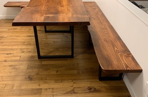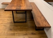 We Built this table and bench out of blue stained pine slabs. It can be tricky staining softwoods, but this table turned out pretty nice, and the customers love the rustic appeal of the live edges, and wood borer holes. The bench is made in two pieces that attach to …